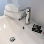 Bidé, badkar och dusch finns i badrummet.